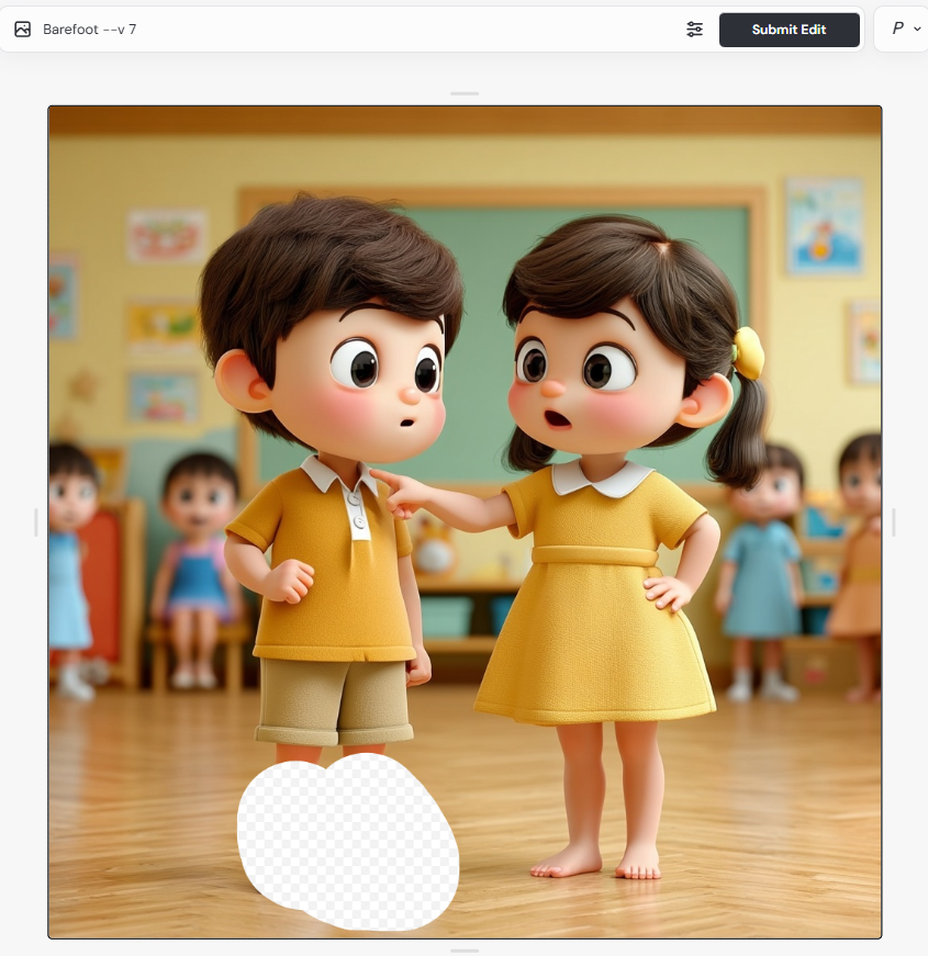 저번에 만든 동화책 삽화를 작업하면서도 제일 애먹었던 부분이었어요. 나는 이 이미지가 좋은데 맨발이 안 나온다ㅠㅠ. 하면서 처음엔 둘 다 맨발이 나올 때까지 이미지 생성을 하다가 결국 Edit으로 제가 고쳐주었답니다. 이 팁은 제일 마지막 5번에서 정리해 드릴게요.