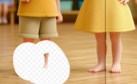 그래서 제가 써본 방법은 레이어 추가해서 살색을 덧입히기. 같은 이미지여도 좋고 자른 부분도 좋아요. 저는 같은 이미지를 레이어 추가해서 저 여자아이의 발과 종아리를 조금만 남겨둔 채로 남자아이의 발 위치에 두었답니다. 이렇게 해서 성공했느냐. 하하. 원래 빠르면 이때 바로 성공하기도 하는데 50% 한 발만 맨발이고 다른 발은 여전히 신발을 신고 있네요.