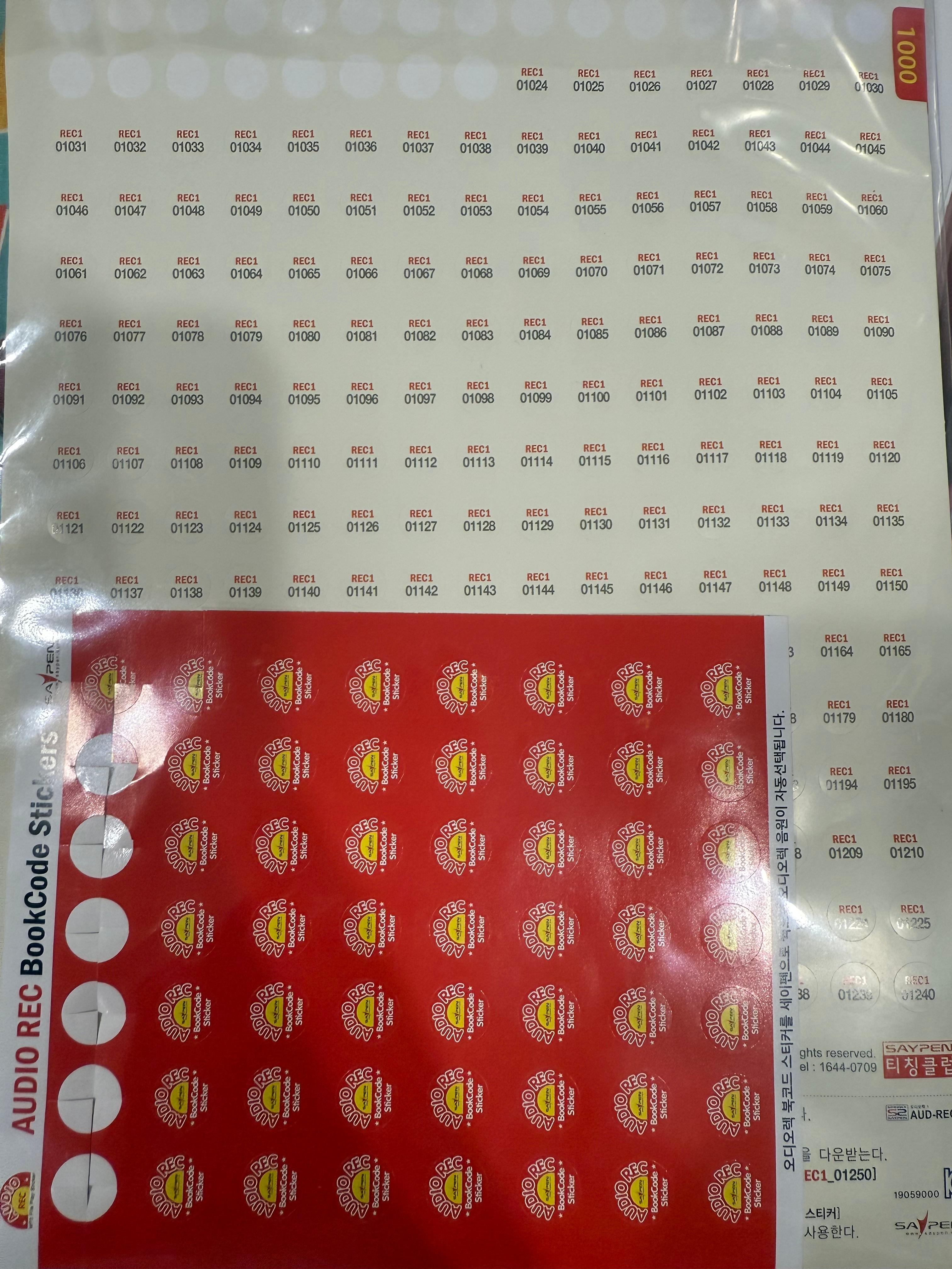 북코드는 사실 구분이 따로 없습니다. 모든 스티커가 동일하게 인식되기 때문에 어느 부분을 찍어도 동일한 북코드 음원이 실행돼요. 그래서 오디오렉처럼 세밀하게 번호 붙일 필요는 없습니다.