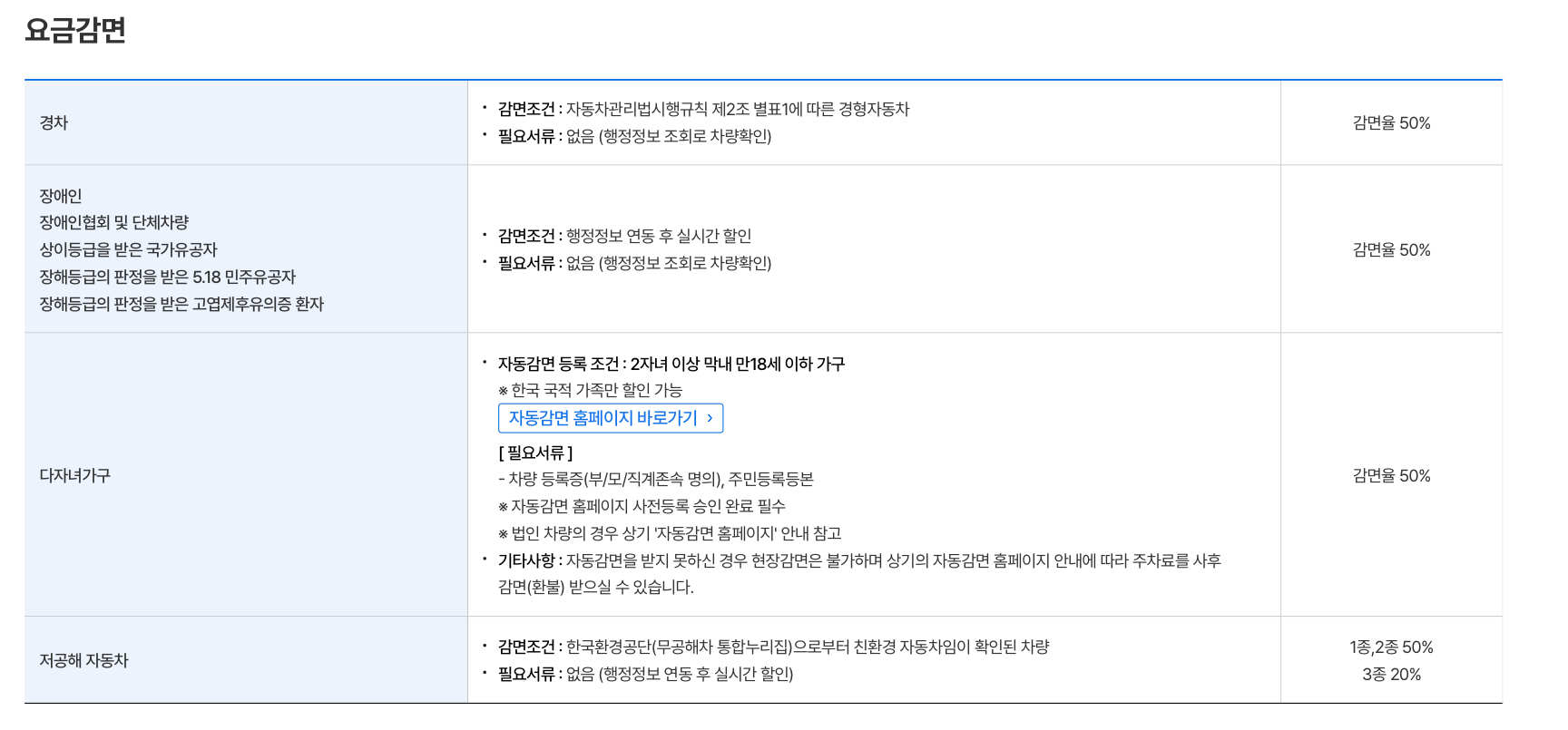 | 장애인차량 | 50% 할인 | 50% 할인 | 50% 할인 |